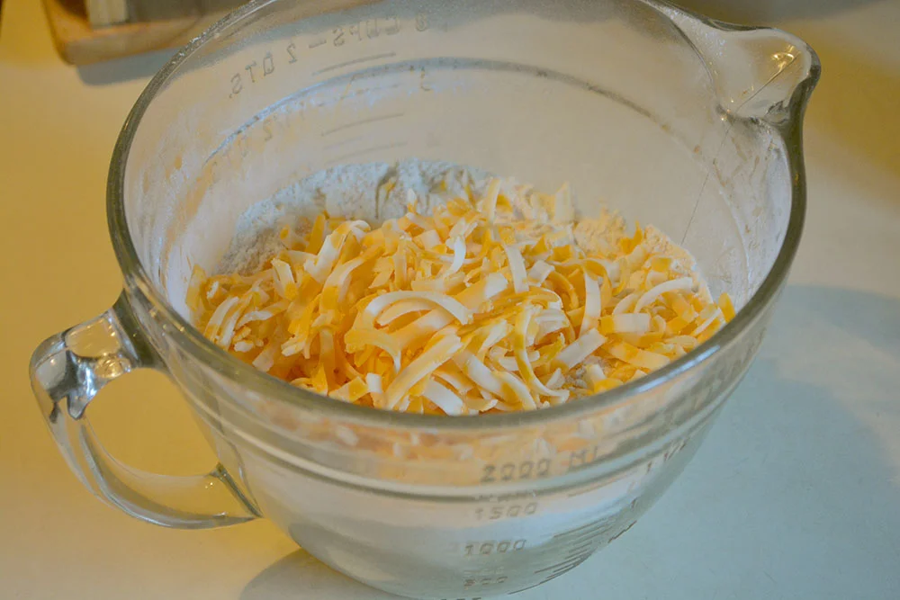Sift Quick Mix, sugar, and garlic powder together. Use spatula to mix in grated cheddar.