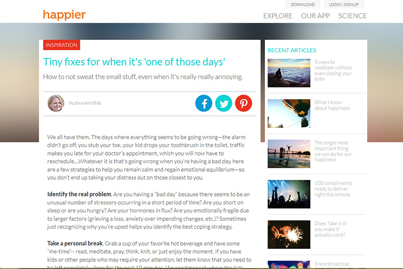 One of the most exciting pieces of news I have had this week is that an article I submitted to the website Happier was published yesterday. Ironically, it was about ways to handle a "bad day". As I re-read the post this morning, I was glad to see that I was following most of my own advice. :-)