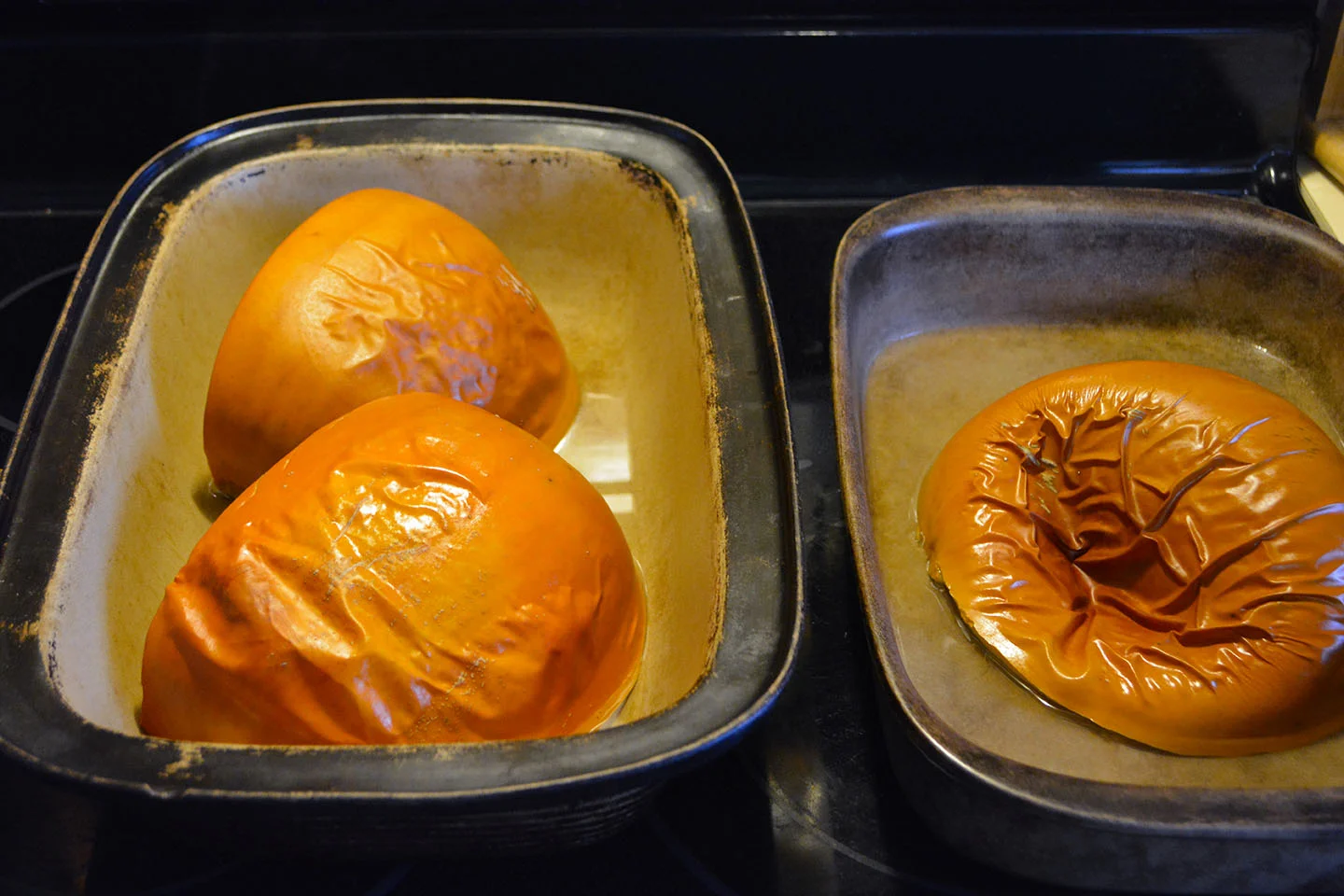 Pumpkin after it has been cooked. The skin has blistered somewhat and the most cooked one has deflated.