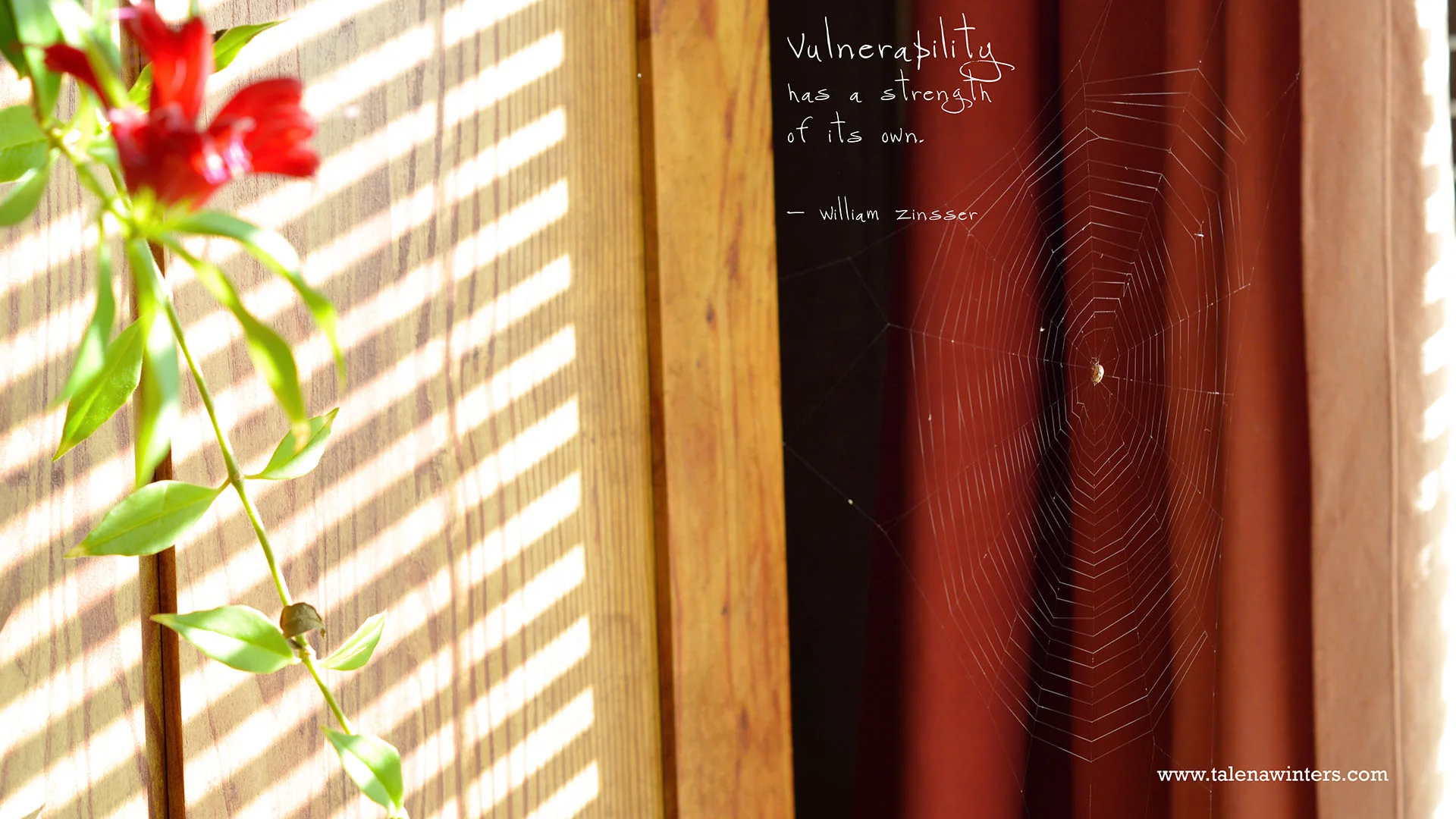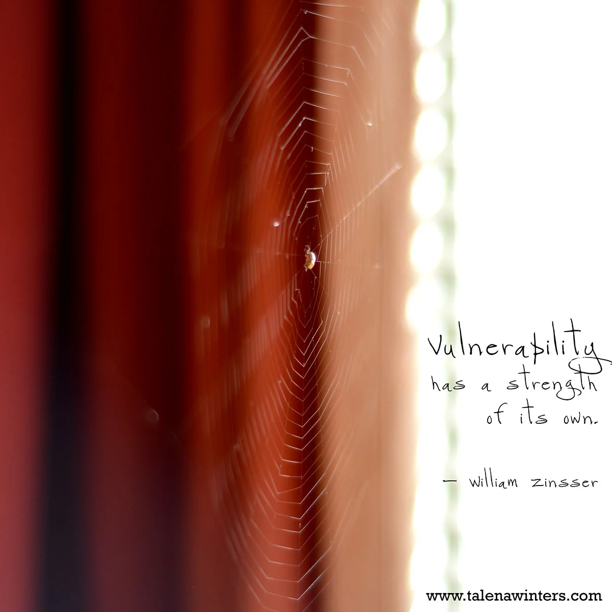 "Vulnerability has a strength of its own." - William Zinsser. Spider on its web in the slatted sunlight of my front window.