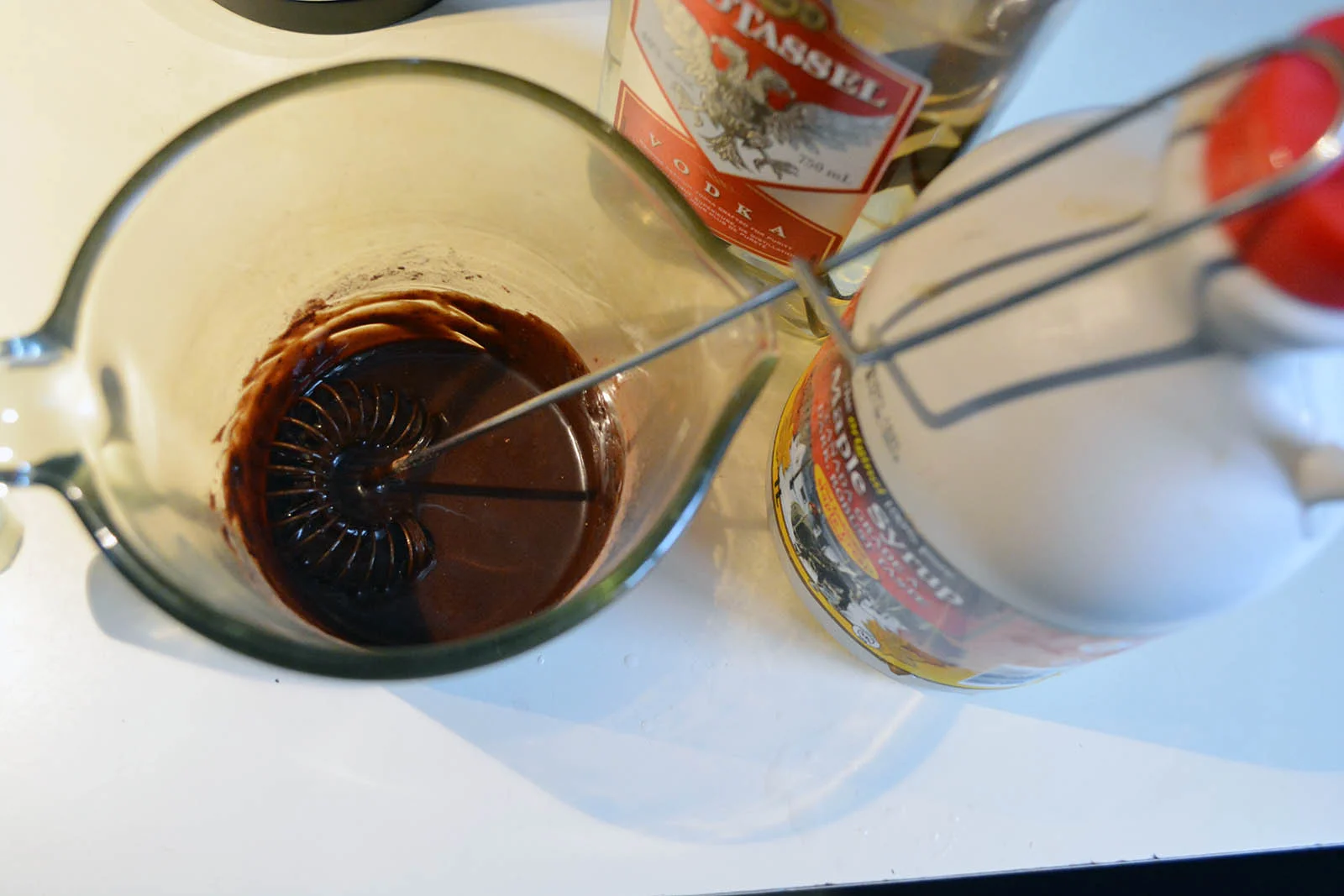 Ingredients for Dairy-Free Hot Chocolate. The vodka bottle is actually homemade vanilla.