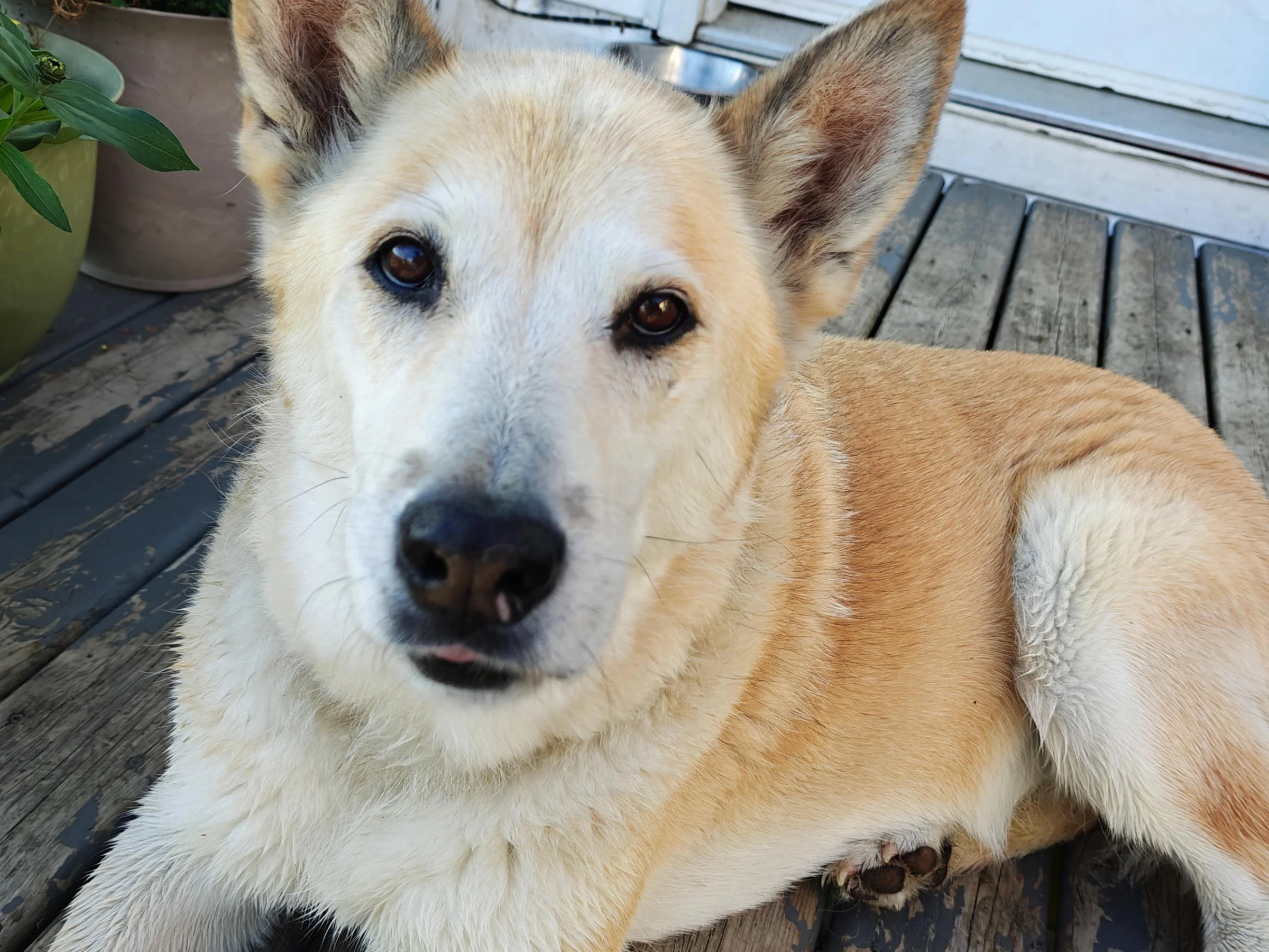 My sweet Daisy chilling in the shade on the deck after a splash in the dugout.